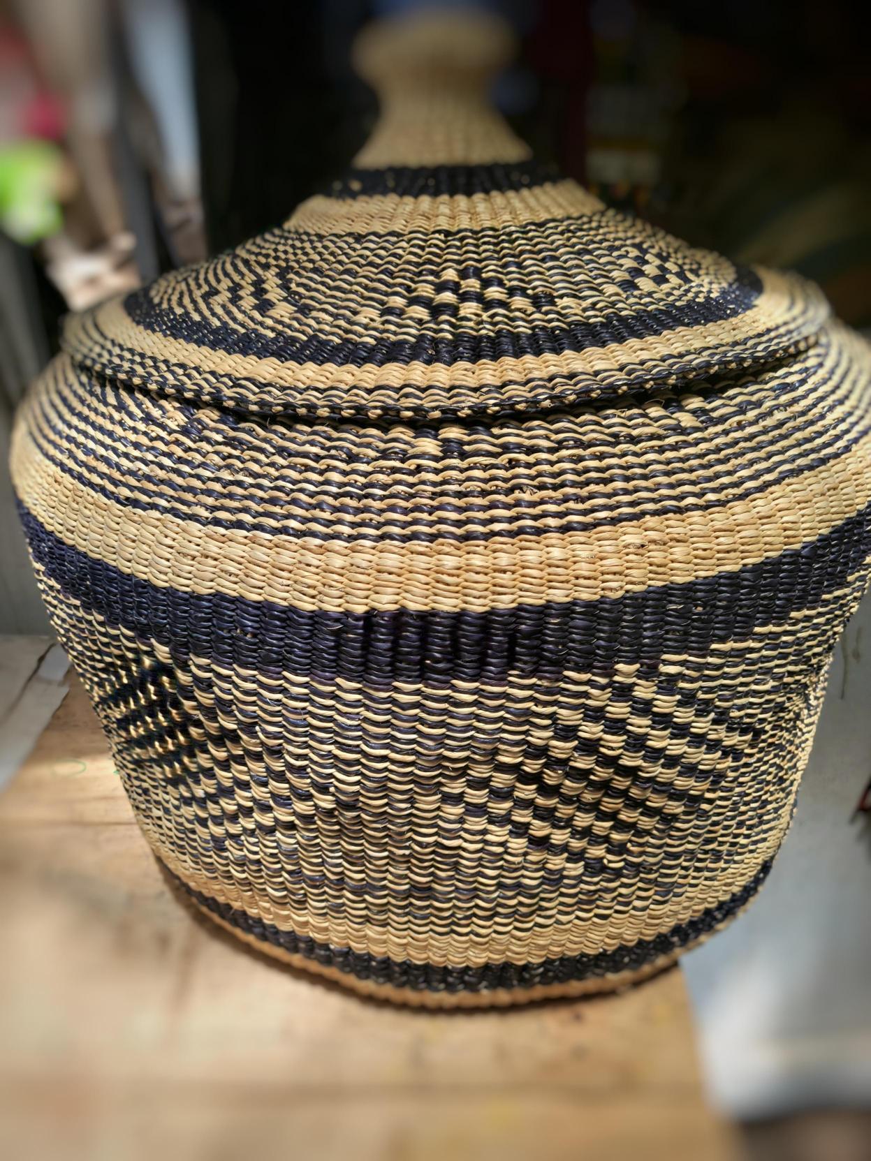 A stunning decorative basket that serves as a beautiful accent piece in any room. Handwoven with intricate artistic patterns and premium materials, this basket combines functional storage with sculptural beauty, transforming everyday organization into an art form.